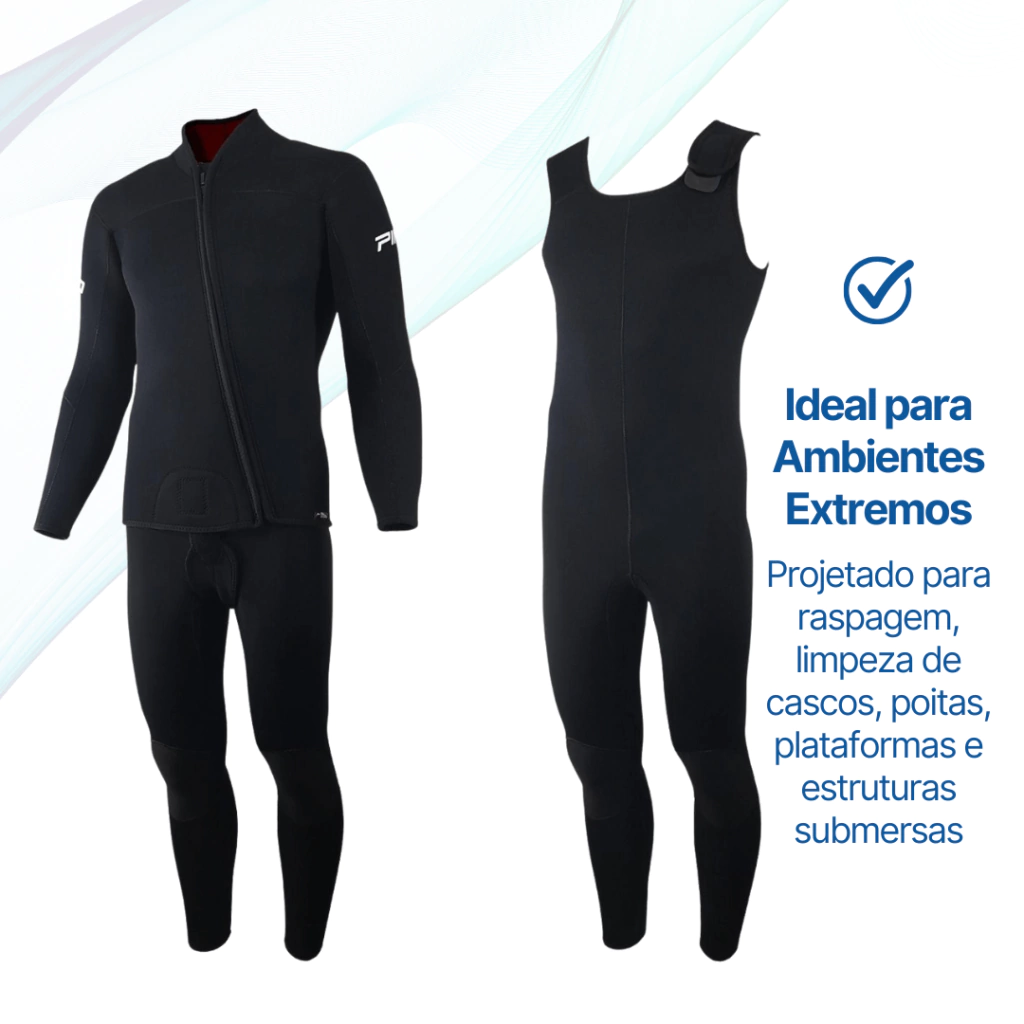 O Conjunto Atlas 5mm é a escolha ideal para profissionais que atuam em ambientes exigentes, como limpeza e raspagem de cascos, plataformas, poitas e tubulações. Desenvolvido com neoprene de 5mm, oferece excelente isolamento térmico, conforto e resistência à abrasão, mesmo nas condições mais adversas.