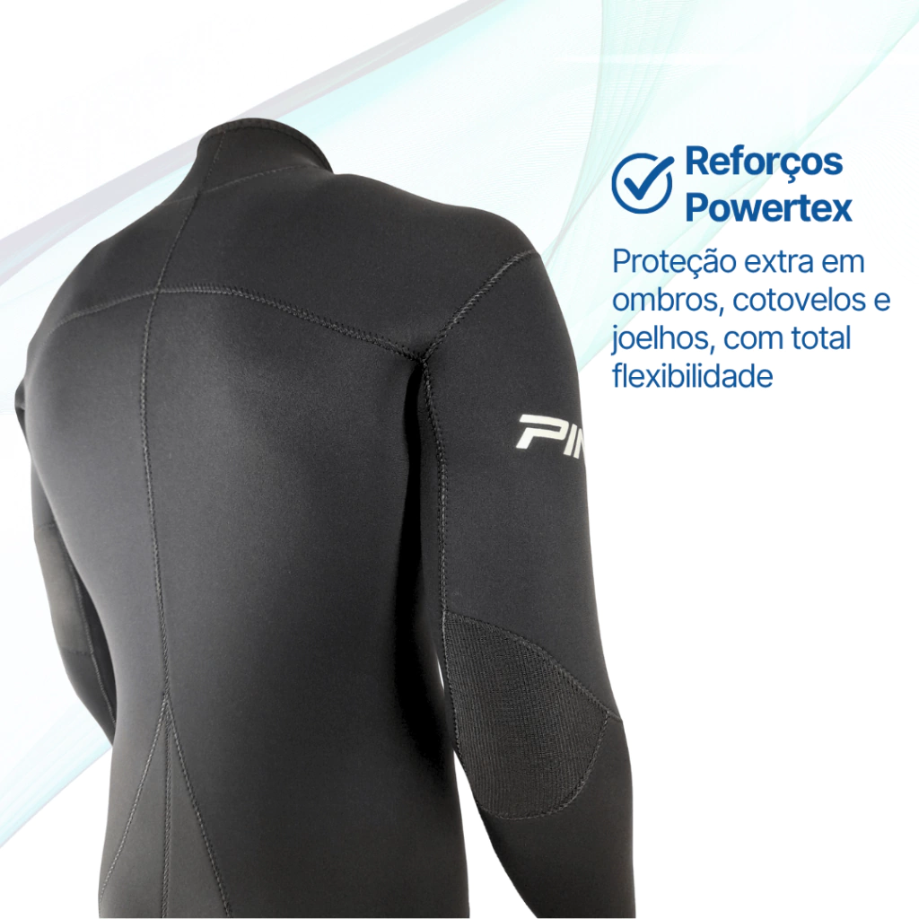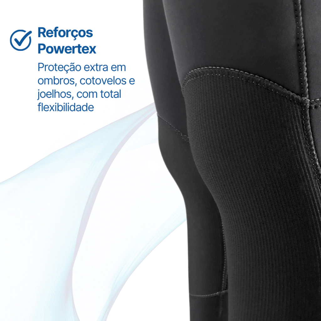 Zonas de alto atrito, como pernas, ombros, antebraços e cotovelos, recebem reforços em Powertex, material ultra resistente que aumenta a durabilidade da peça