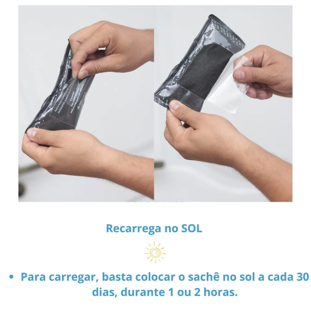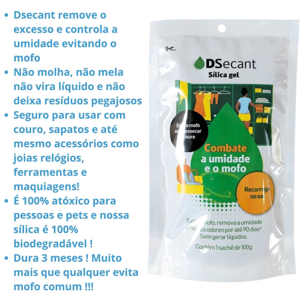 Ideal para ambientes como armários, closets, sapateiras, gavetas, entre outros, o DSecant evita mofo, fungos e maus odores, prolongando a vida útil dos seus pertences. Com sílica gel inteligente, ele controla a umidade sem ressecar, permitindo uso seguro em couro, calçados, acessórios e até mesmo eletrônicos. É recarregável ao sol e dura até 90 dias!