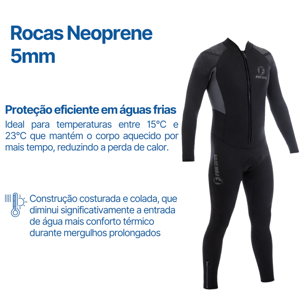 Confeccionada em neoprene 5 mm de boa elasticidade, oferece excelente equilíbrio entre isolamento térmico, conforto e liberdade de movimento. Indicada para uso em águas entre 15°C e 23°C, é ideal tanto para mergulhadores recreativos quanto para uso profissional.