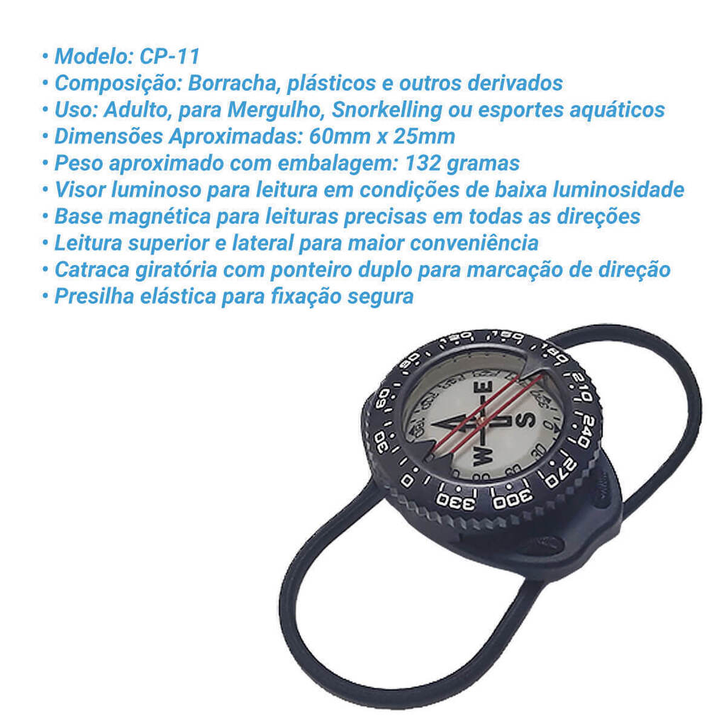 Equipada com uma base magnética que se movimenta para todas as direções, a bússola CP-11 assegura leituras precisas, independentemente de estar perfeitamente nivelada. Uma característica notável desta bússola é a possibilidade de fazer a leitura a partir do topo ou lateralmente através de uma janela especial de visão, otimizando a facilidade de uso durante o mergulho.