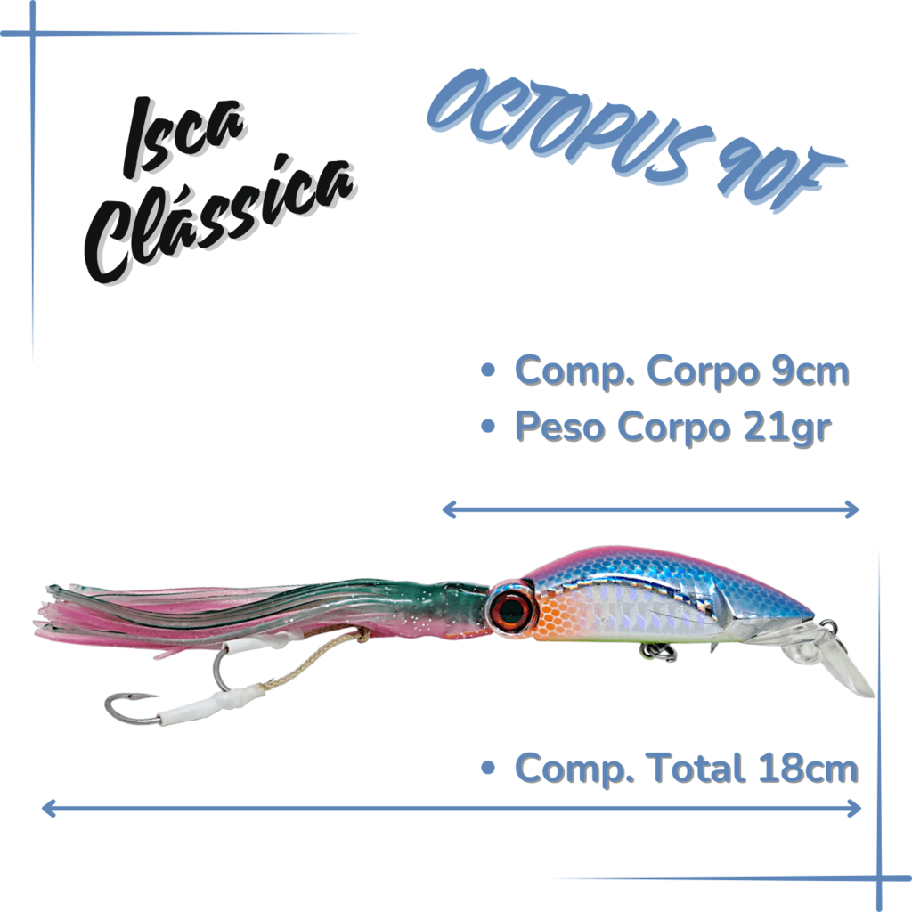 A Isca Artificial Poseidon OCTOPUS 90F é uma obra-prima da engenharia de pesca, projetada para imitar com perfeição um dos moluscos mais formidáveis dos mares: as lulas! Com um design inovador e cores vibrantes, esta isca oferece um poder de atração superior, garantindo sucesso na captura dos predadores mais exigentes.