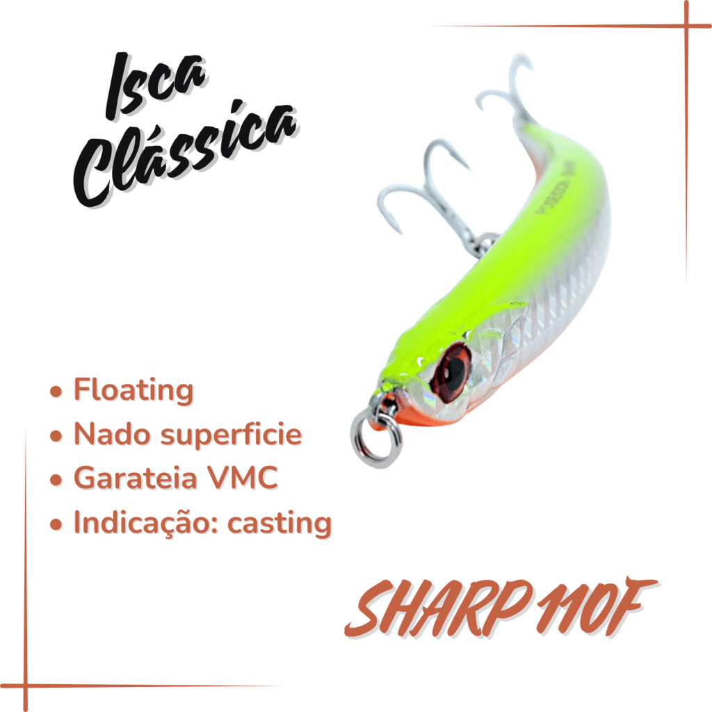 Com um corpo feito de ABS reforçado, arame cervical e garateias VMC 3x, a *Sharp 110F* foi projetada para suportar ataques vigorosos de predadores brasileiros, incluindo espécies de porte médio. É uma excelente escolha para pescadores que buscam uma isca de alta durabilidade e eficiência.